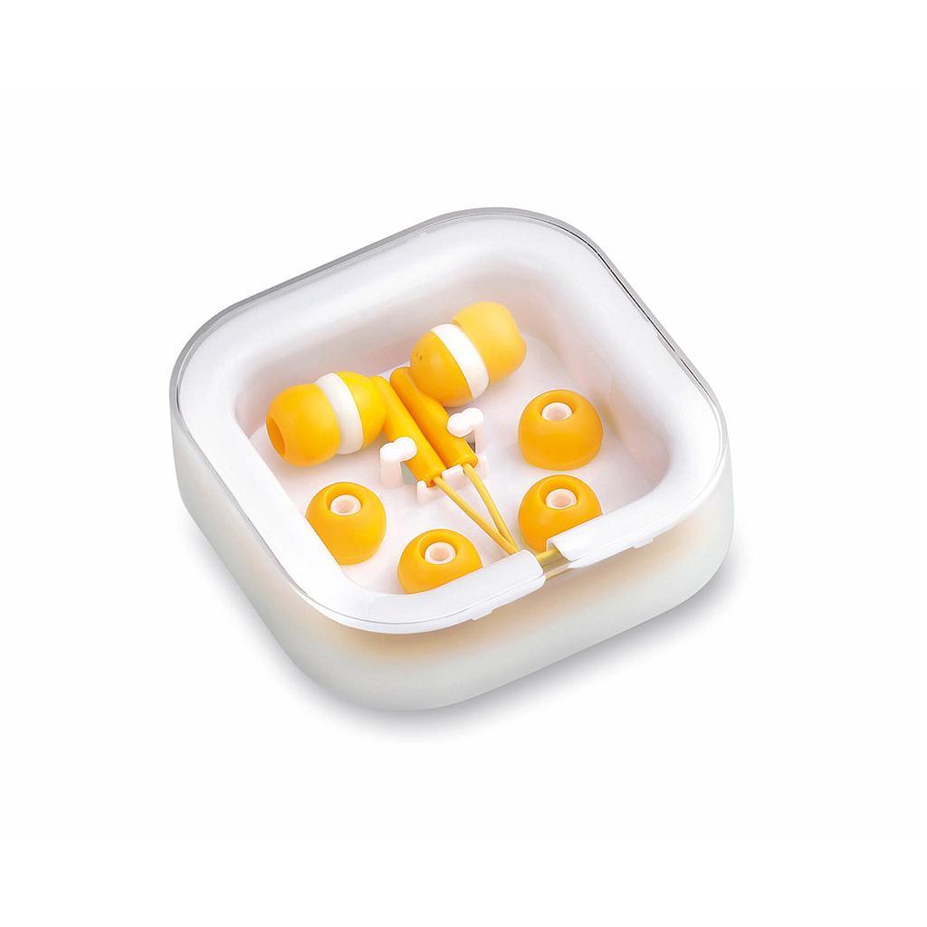Prácticos y confortables audífonos intraurales de desenfadado diseño bicolor, conexión jack de 3,5mm y cable en color a juego. Presentados en elegante estuche de diseño y con almohadillas de recambio.