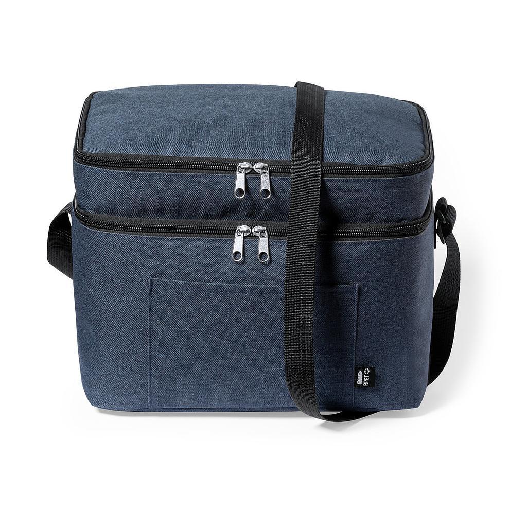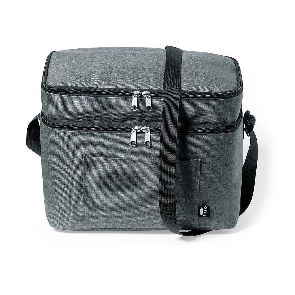Lonchera fabricada en resistente 600D RPET. Incluye 2 compartimentos independientes, con cierre de zíper y doble tirador metálico. Interior isotermo en PEVA, con cinta bandolera ajustable y bolsillo exterior. Disponible en variada gama de colores, con etiqueta exterior con distintivo RPET.