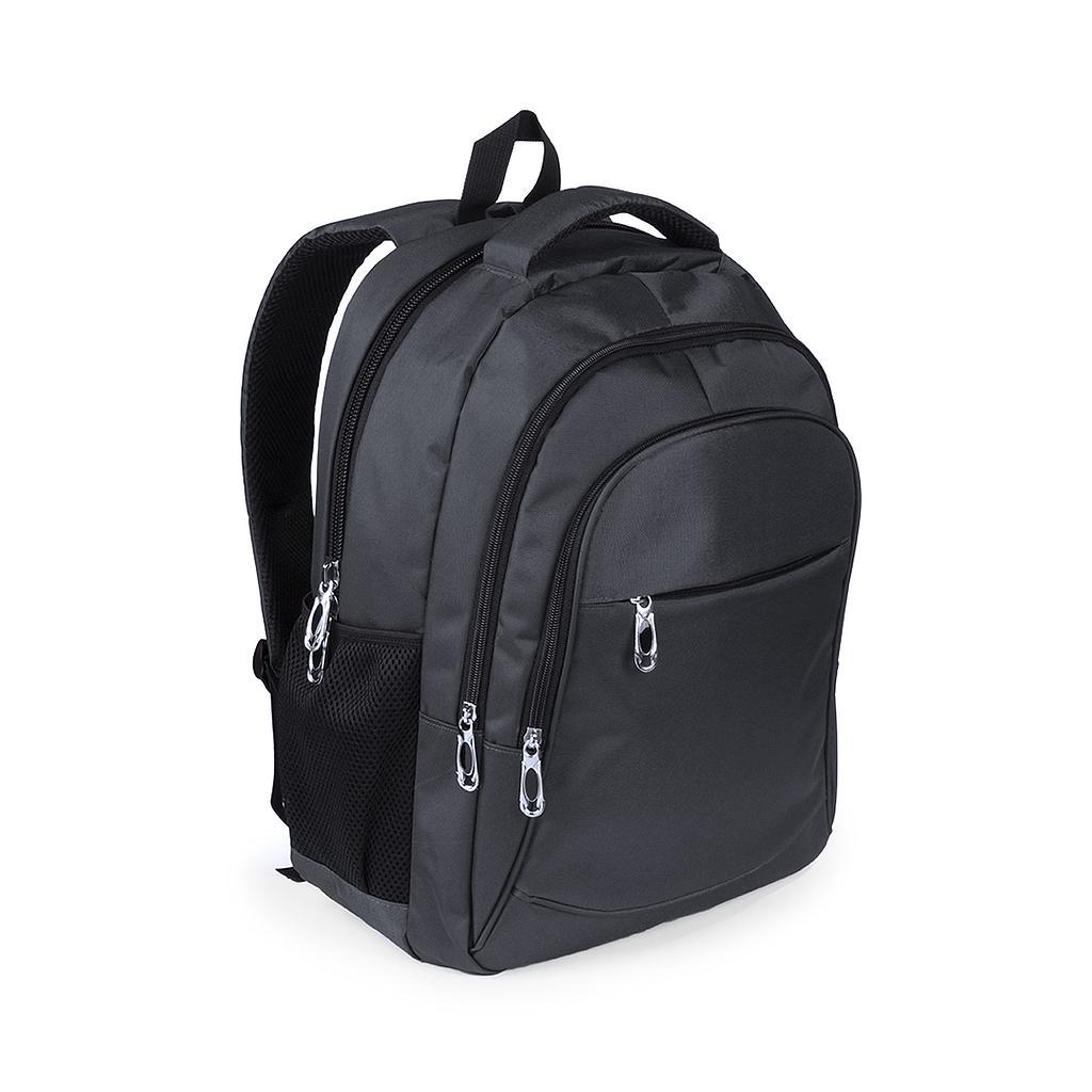 Mochila fabricada en resistente nylon 600D. con cierre de zipper, bolsas frontales y asa reforzada doble. Con acolchado ergonómico en espalda y cintas de hombros, incluye compartimento interior acolchado para laptod de hasta 15".