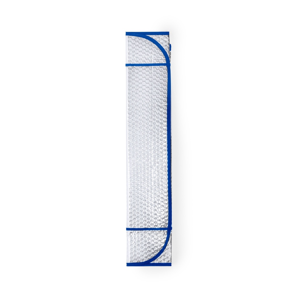 Parasol en aluminio con burbuja en ambas caras. Acabado plateado metalizado, con ribetes en color negro y en tamaño 130 x 70 cm. Con cintas elásticas para plegado y presentación desplegado en plancha para fácil impresión. 1 logotipo estampado en serigrafía a 1 color.