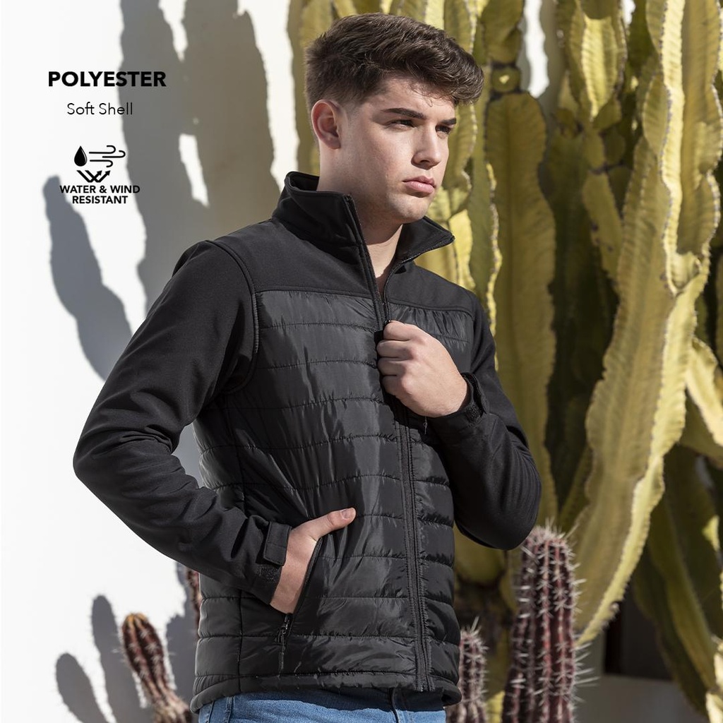 Chumpa impermeable y transpirable en combinación de materiales soft shell y poliéster, en color negro, con cierre de zipper y bolsillos laterales de cremallera con tiradores para fácil apertura. Puños ajustables y disponible en tallas S, M, L, XL, XXL.